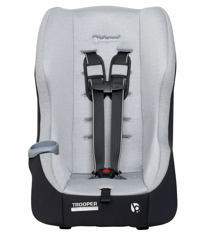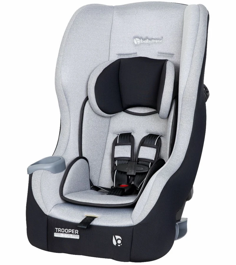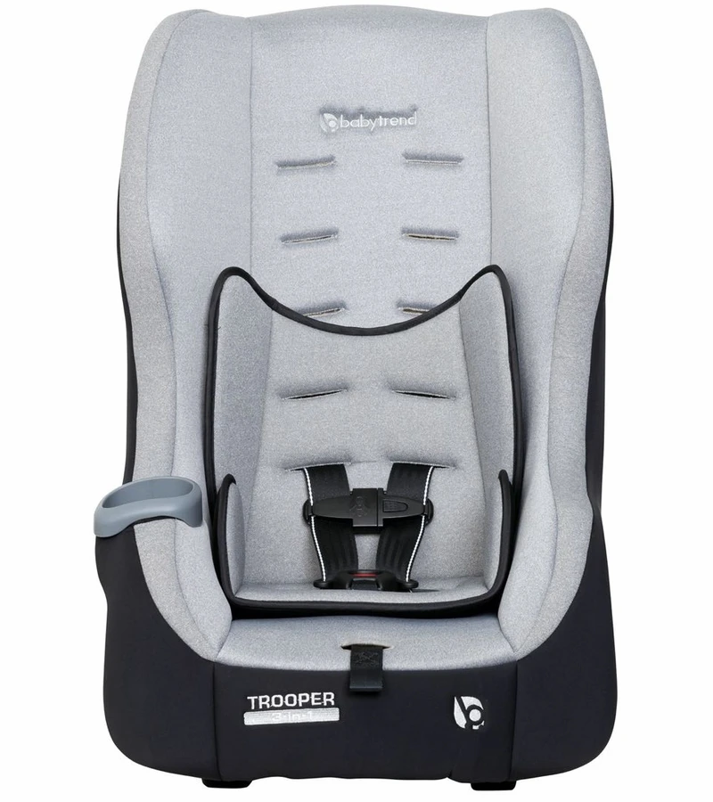 The Baby Trend Trooper 3-in-1 Convertible Car Seat converts from rear-facing infant seat (4-18lbs) and rear-facing toddler seat (18-40lbs) to forward-facing toddler seat (22-65lbs) as your child grows. With 5-position shoulder height adjustment and 3- position crotch buckle for seat adjustment, the Trooper convertible gives parents the ultra-convenience for installation and adjustment. The rear-facing recline flip foot also allows the Trooper to get great installation angles with ease. Trooper’s nimble frame can fit three across in most vehicles which is great for families that have more than one kiddo. The lightweight shell also allows for use of LATCH installation up to 55 lbs. The super-deep side wings offer better side impact protection and premium cushion, giving your babies great head protection and support. With premium fabric and the convenient integrated cup holder on the side, our Baby Trend Trooper 3-in-1 Convertible Car Seat truly gives your children the most comfortable and convenient commute/travel experience.