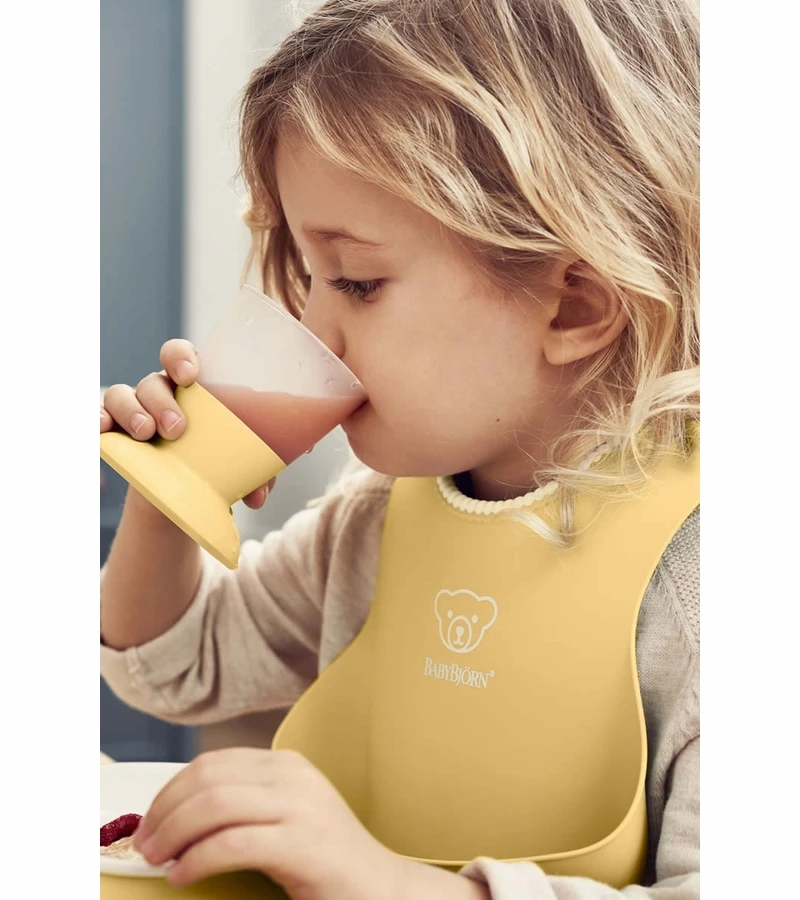 Our feeding bib set is the perfect choice for a family with young children: one bib for the tiniest diner and one for the slightly larger foodie. The feeding bib set is also a good choice when your growing baby needs a larger bib. We want to make learning to self-feed fun for your baby! The pliable plastic and the size of the bibs ensure that they dont get caught on the edge of the table or prevent your baby from moving their arms freely. The generous spill pocket catches any food that doesnt make it into your babys mouth, so their clothes stay clean and dry. For easier, happier and less messy mealtimes! After each meal, the bibs are easy for you to wipe clean or pop in your dishwasher. They dry quickly and are soon ready for you to use again.