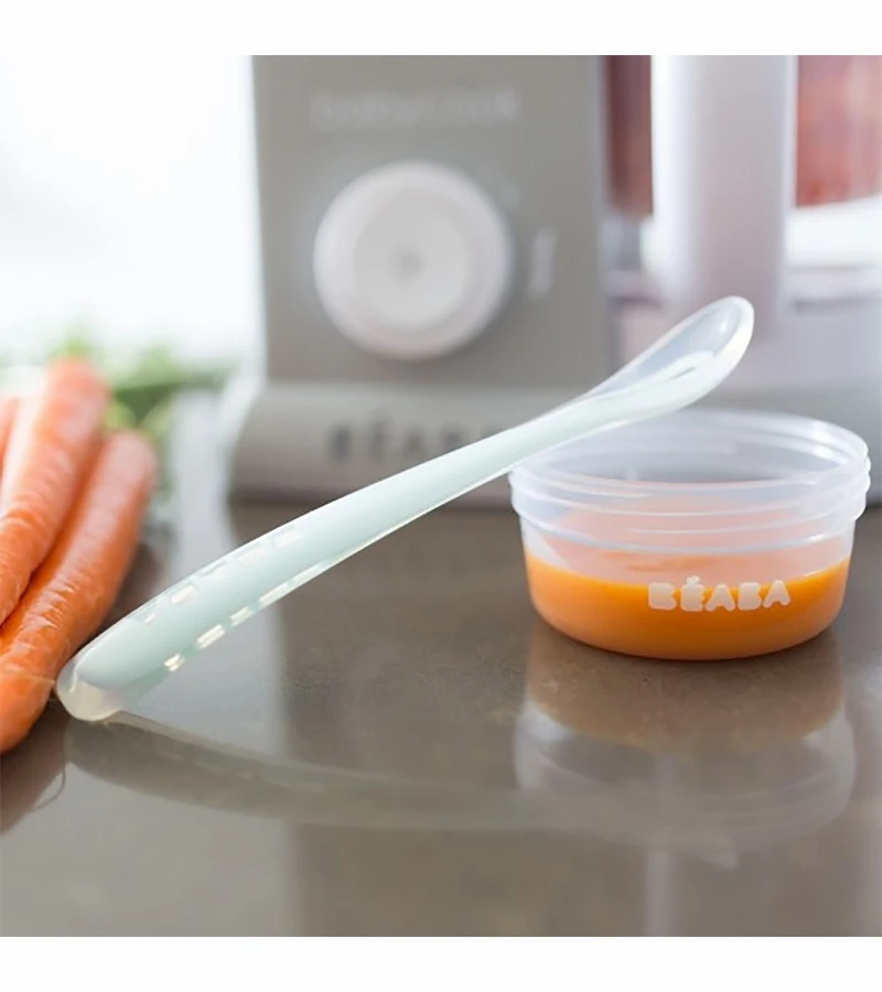 This set of 4 first stage silicone spoons is designed for babies being introduced to solids. The handle is designed for adult hands easily to be able to feed baby. Made of ultra supple silicone to be kind to baby’s gums. Dishwasher safe.