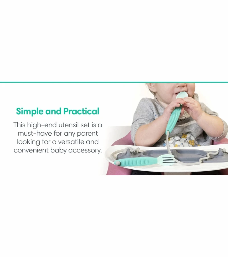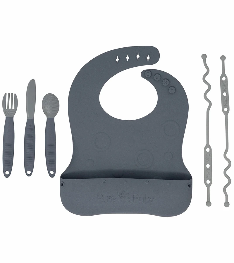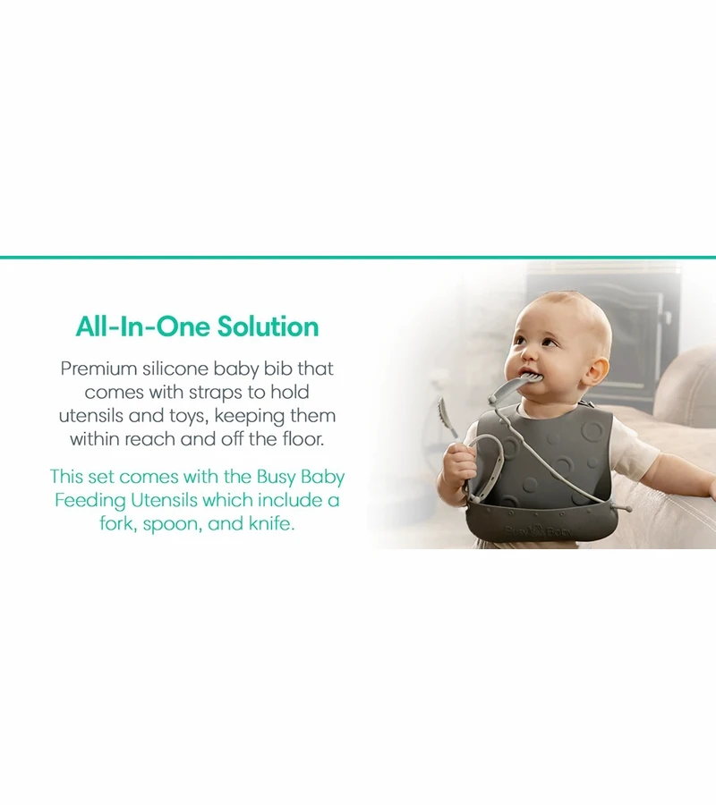 Introducing the all-in-one solution for mealtime and playtime with your baby – The first-ever premium silicone baby bib that comes with straps to hold utensils and toys! This set comes with the Busy Baby Feeding Utensils which include a fork, spoon, and knife.