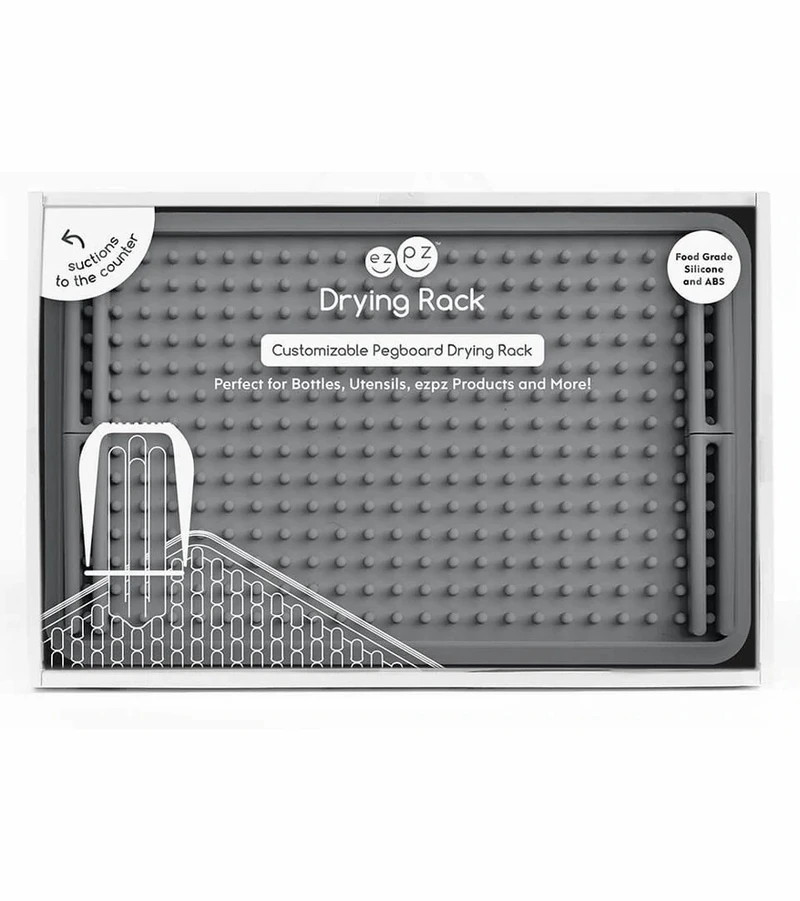 The ezpz Drying Rack was designed to help dry + store all of your essential baby / toddler gear – including ezpz products! The removable pegs make the rack customizable to suit your drying needs. Plus, modern-day parents can proudly display the chic design on their counter. Includes one mat and four pegs.