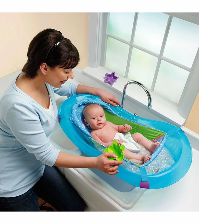 Make bath time more comfortable for you and baby with the Aquarium Bath Center that grows with baby from newborn to toddler! The unique sling supports and cradles your newborn comfortably and safely. As baby grows, the sling can be adjusted to hang from the narrow end of the tub to provide reclining support. When your toddler needs more room, he can sit at the wider end of the tub. Lots of bathtime accessories and an infant head support included.