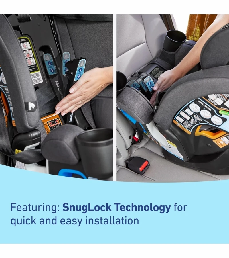 - SnugLock® technology installs in less than one minute* using vehicle seat belt or LATCH *Based on average time to buckle or latch, remove slack, and lock for secure install