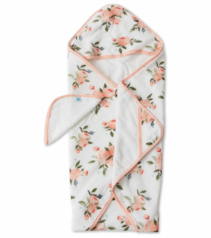 Clean and warm. Bath towel with printed cotton muslin on one side and ultra-soft terry cloth on the other; a cozy hood and pockets for little hands.