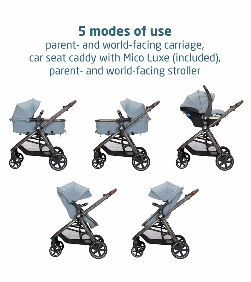 The ZeliaTM2 Luxe 5-in-1 Modular Travel System is designed to help you stroll into parenthood with ease. So versatile, you can step out with your baby from day 1 and be prepared to journey through years of adventures together. Transition smoothly between 5 modes: switches easily between parent-facing car seat caddy, reversible carriage, and reversible stroller. The included lightweight Mico Luxe Infant Car Seat is made for safety plus coziness for your baby with Side Impact Protection (SIP), removable plush infant inserts, and premium PureCosi™ fabrics that keep your little one comfy, yet can be removed quickly without the need to rethread the harness when it’s time to machine wash and dry them. Vegan-leather accents on the stroller and car seat add style and comfort.