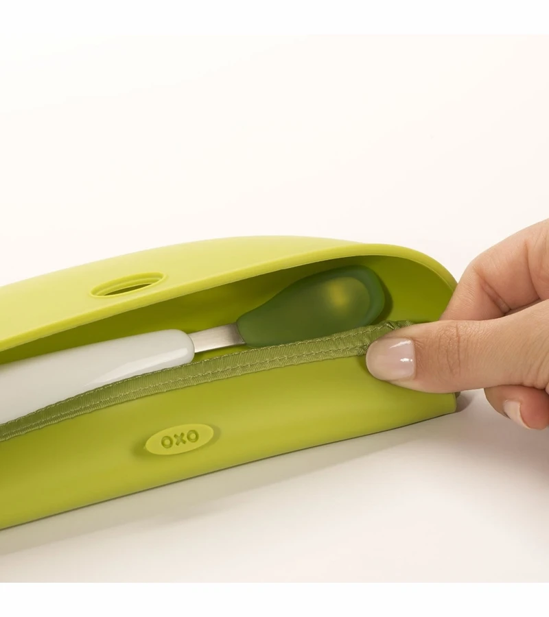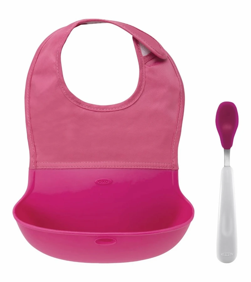 Whether feeding baby at home or on the go, keep it clean with the OXO Tot Roll Up Bib and Spoon Set. The Bibs soft, food-safe pocket is wide enough to catch virtually any stray pieces of food that miss babys mouth. The fabric portion of the Bib provides ample coverage to protect babys clothes, and is shaped for comfort during mealtime. Easy-to-use Velcro closure is secure enough to resist tots tugging (really!) and is adjustable as your little one grows. Both the fabric and silicone materials are easy to wipe clean. Feeding Spoon has a protective food-grade silicone coating which is gentle on babys gums and mouth. The soft edges of the silicone can be used to scrape the last bit of sweet potato from the bowl or jar, or to gently wipe applesauce from babys face. The shallow Spoon prevents feeding baby too much food at once. A contoured handle is comfortable to hold and angled for easy feeding. When youre out and about, simply roll the Silicone Spoon up in the Bibs fabric and into the silicone pocket, secure closed and tuck into a diaper bag. BPA, PVC, and phthalate free.
