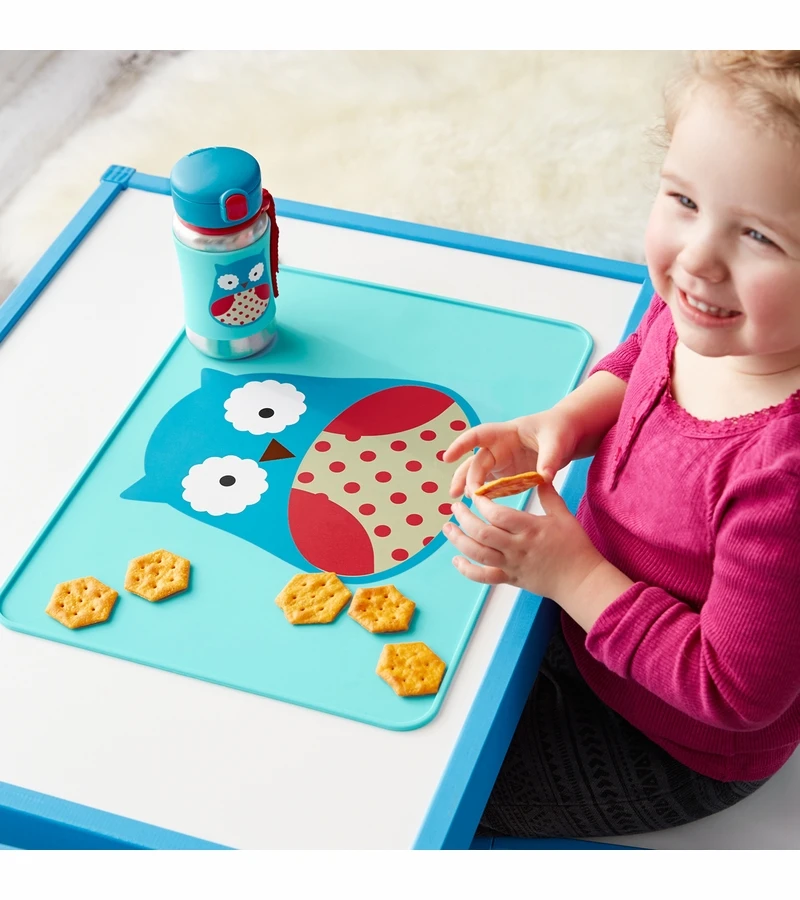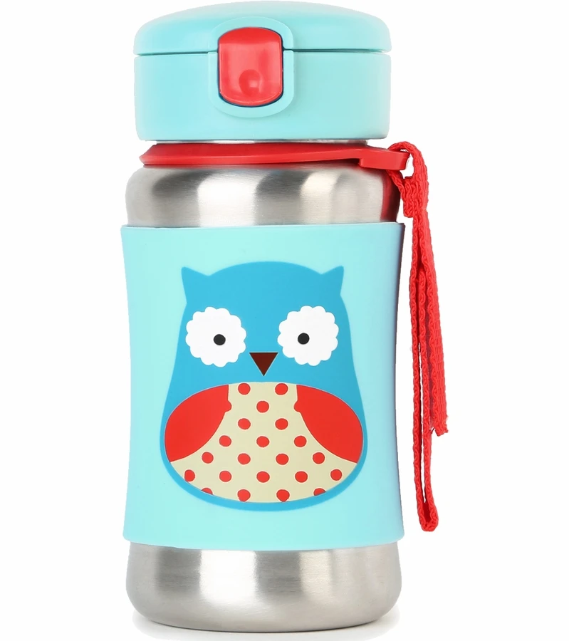 This kids’ stainless steel water bottle has a no-slip silicone sleeve to protect little hands from cold surfaces. Featuring signature Skip Hop Zoo characters, it has a handy grab-me strap that attaches to anything, along with a pop-up lid so the flexible straw stays clean.