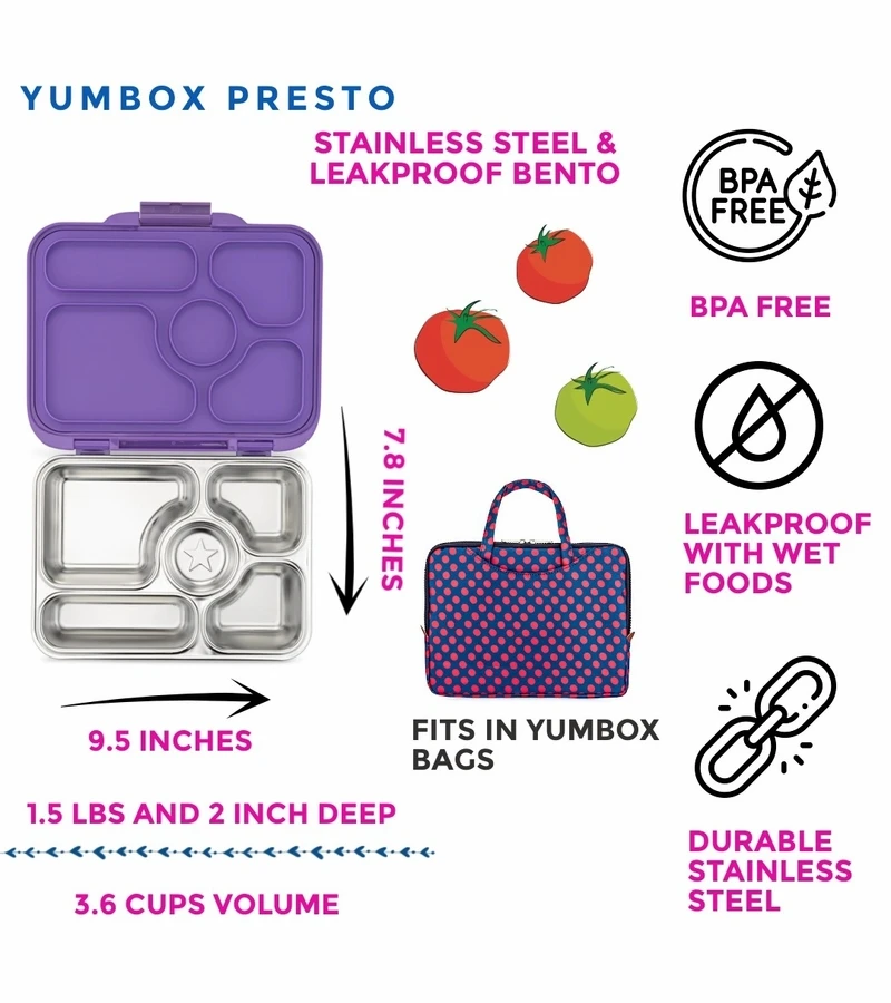 - High Quality & Durable: Yumbox Presto is made using all food-safe materials, BPA-free and phthalates-free. Yumbox is compact & lightweight.Â